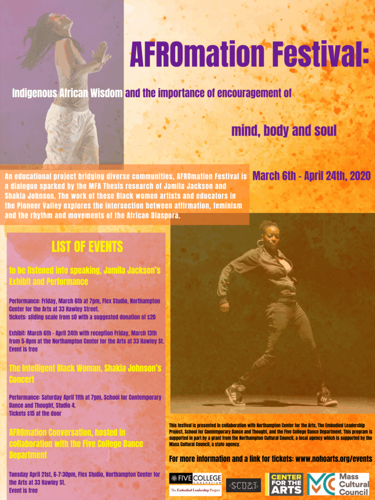 AFROmation Festival was an educational and performance-based initiative designed to bridge diverse communities through dialogue, scholarship, and embodied practice. Rooted in the MFA thesis of both myself and Jamila Jackson, the festival asked: How does intelligence and the importance of affirmation bring healing to communities? Although we originally envisioned the festival as an in-person series of performances, workshops, and public discussions, we reimagined it as a virtual event in response to the COVID-19 pandemic. Even in this adapted format, AFROmation remained committed to exploring the intersections of affirmation, feminism, and the rhythms and movements of the African Diaspora. The Intelligent Black Woman served as the culminating event of the festival, offering audiences a powerful virtual embodiment of the festival’s themes and grounding our intentions in the lived and creative experiences of Black women.